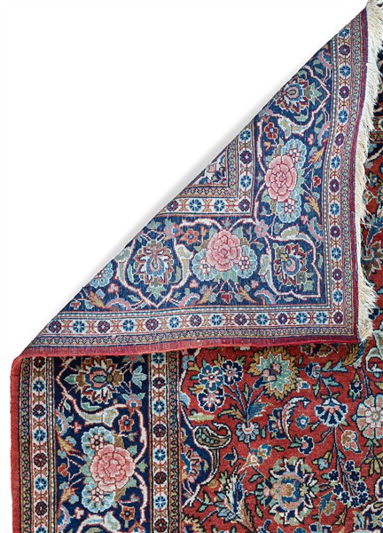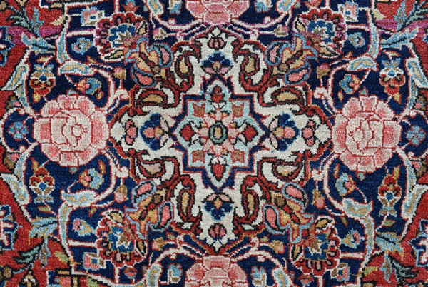 Tappeto Keshan, Persia, secolo XX. Decoro con medaglione a fondo blu notte con puntali, ornato da rose Kadjar come la bordura (cm 208x131) (difetti)