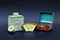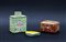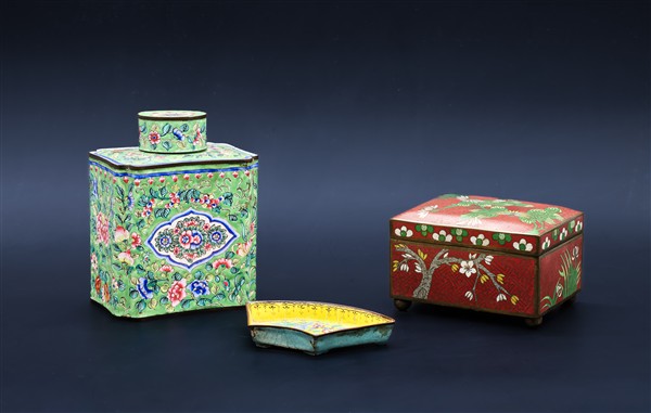 Lotto composto da una scatola in smalti cloisonnè (cm 12x7x9) una bottiglia con coperchio in metallo smaltato (h. cm 15) a fondo verde e un piccolo recipiente sagomato in metallo smaltato (cm 10x1x8)