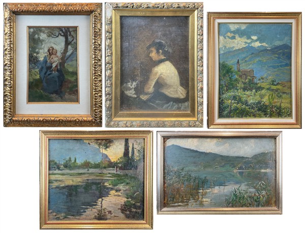 Lotto composto da cinque dipinti di diversi soggetti ad olio su diversi supporti