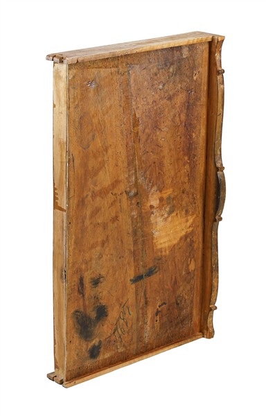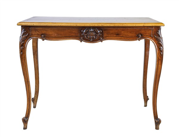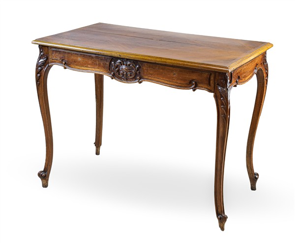 Scrittoio da centro in noce con piano rettangolare e un cassetto nella fascia, gambe mosse terminanti a ricciolo e decori ad intaglio a foglie. Secolo XIX (cm 100x68x72) (difetti e restauri)