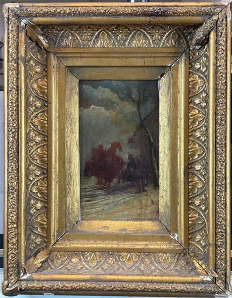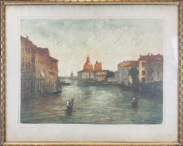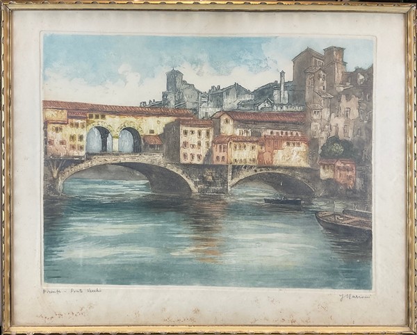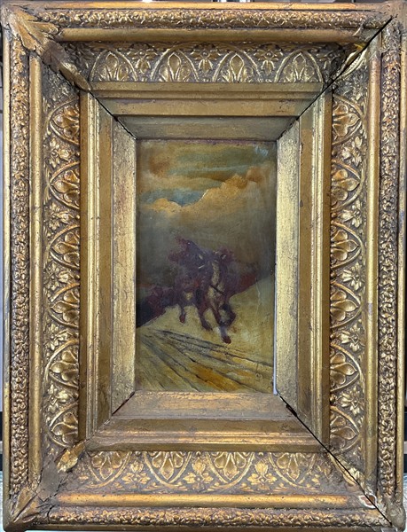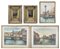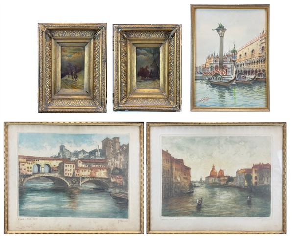 Lotto composto da una "Veduta veneziana" ad acquarello su carta, due dipinti ad olio su tavola raffiguranti "Cavalieri" e due stampe policrome raffiguranti "Veduta veneziana" e "Veduta fiorentina", di diversi autori e misure (cm max 45x55)