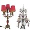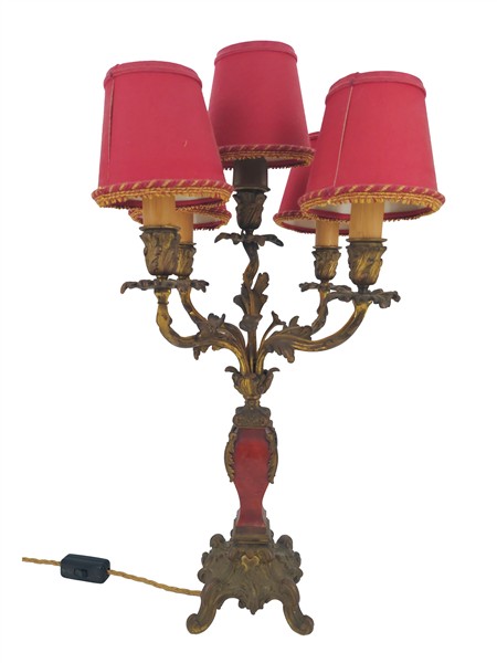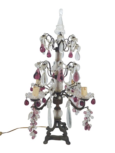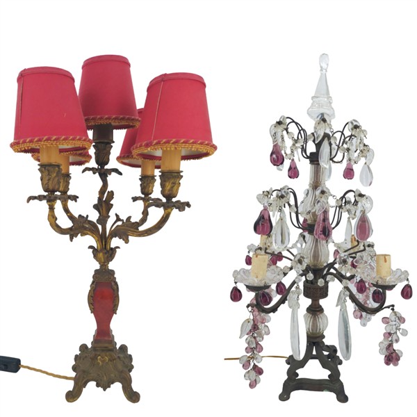 Lotto composto da una lampada "girandole" a quattro luci in metallo e pendenti in vetro a goccia e grappoli d'uva (h cm 54), ed un candelabro a cinque luci in metallo dorato e legno a finta tartaruga, elettrificato in epoca posteriore con paralumi (h tot cm 68) (difetti)