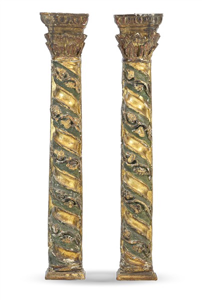 Coppia di semicolonne a torciglione in legno laccato e dorato con intagli a pampini e grappoli d'uva, capitelli a motivi fogliacei, realizzate con elementi antichi (h cm 101) (difetti e restauri)