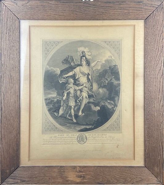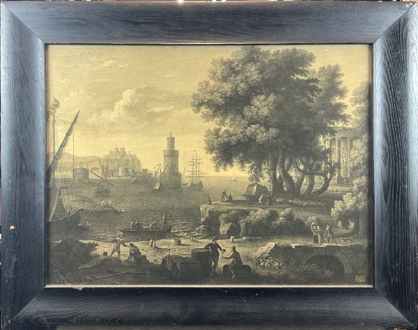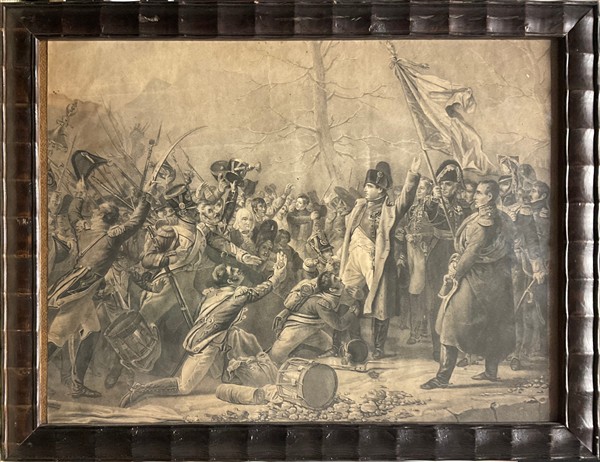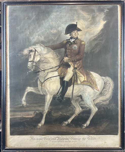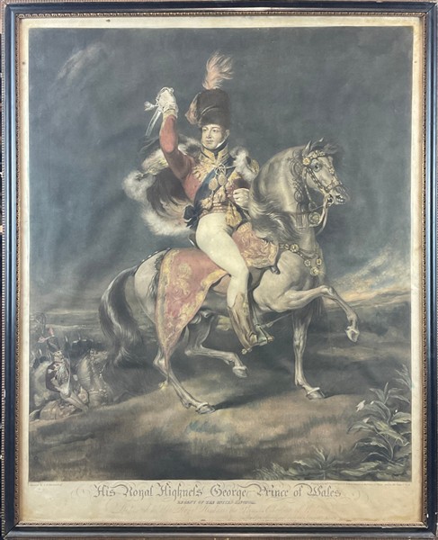 Lotto composto da due stampe a colori raffiguranti reali inglesi a cavallo (fogli cm 72x59), una stampa a soggetto napoleonico (foglio cm 29x37,5), ed altre due incisioni raffiguranti una scena portuale e una mitologica, in cornici (difetti)