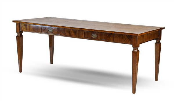 Tavolo lastronato in noce e filettato in legni vari con piano rettangolare e due cassetti nella fascia, gambe ad obelisco rovesciato. Secolo XIX (cm 216x80,5x85) (lievi difetti)