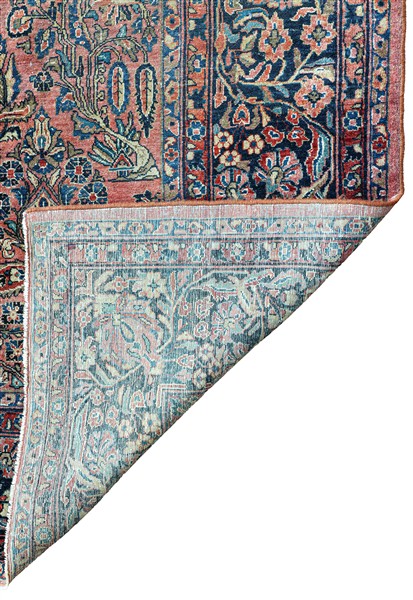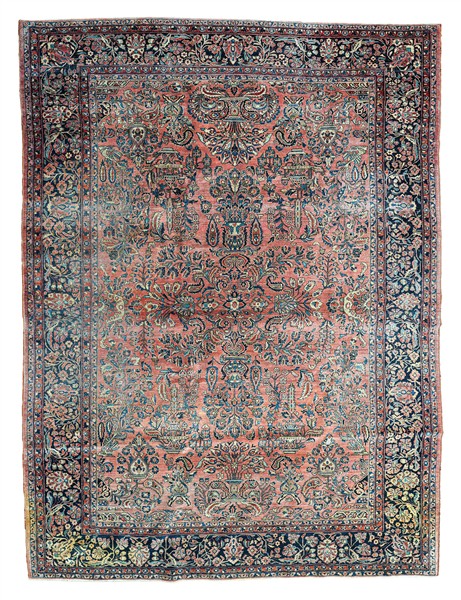 Tappeto Sarouk, Persia, fine secolo XIX. Decoro floreale sparso in policromia su fondo rosa, tinto successivamente per arrivare al color ciclamino intenso. Bordura principale a fondo blu con motivo Herati (cm 370x263) (difetti)