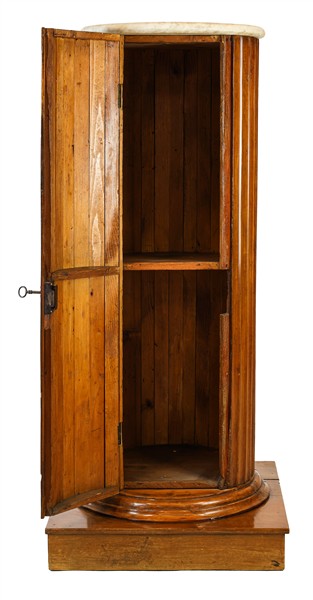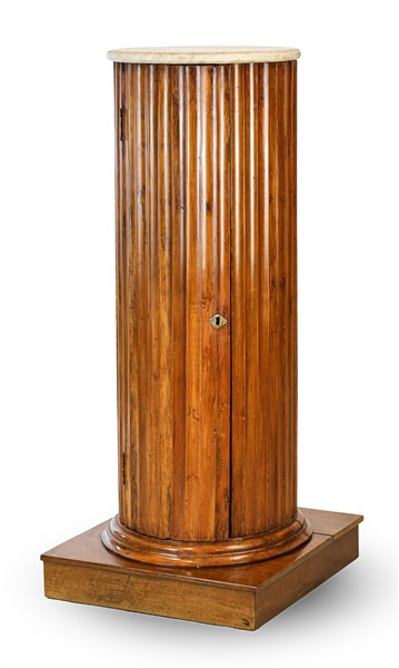 Colonna portabusto scanalata in noce su base quadrata con anta frontale e piano in marmo bianco. Secolo XIX (cm 116,50x 52,5) (difetti)