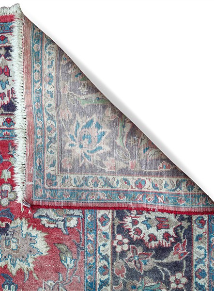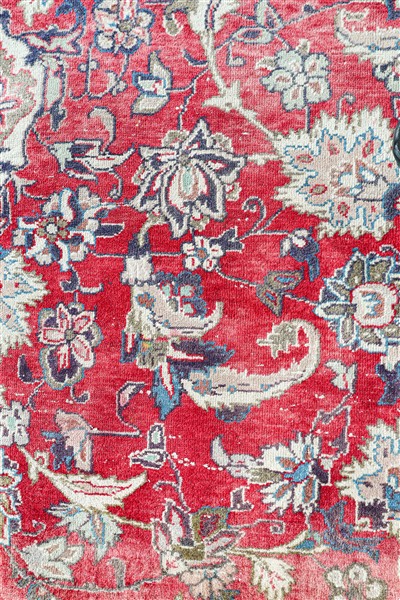 Tappeto Sarouk, Persia, secolo XX. Decoro con medaglione stellato e rami fioriti su fondo rosso (cm 333x231) (difetti e rapature)