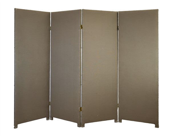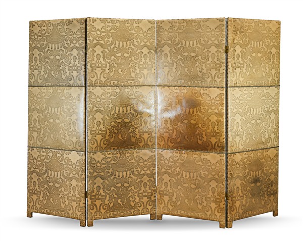 Paravento a quattro ante imbottite e rivestite in pelle stampata con bordure borchiate (aperto cm 180x254) (difetti)