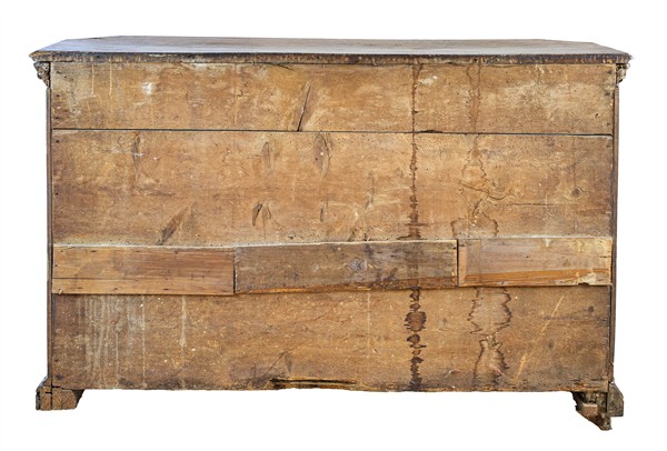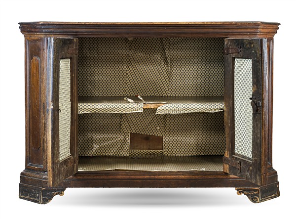 Credenza scantonata in noce a due sportelli pannellati e lesene con rilievi mistilinei, piedi a mensola, secolo XVIII (cm 135x91x54) (difetti, restauri, piedi posteriori e chiavi mancanti)