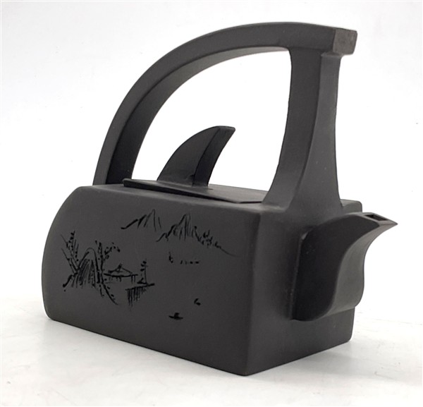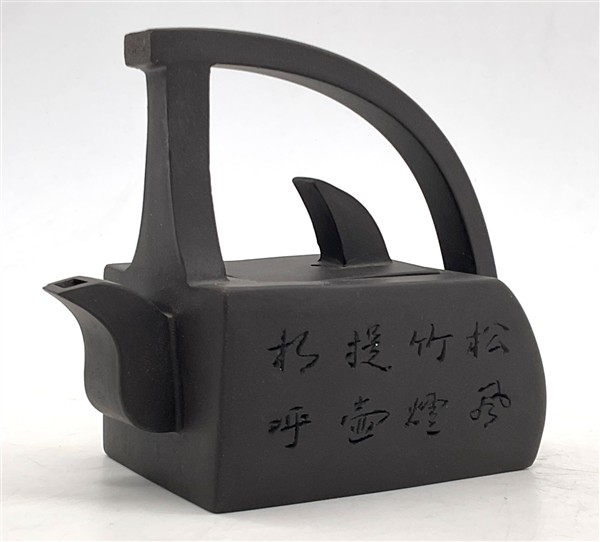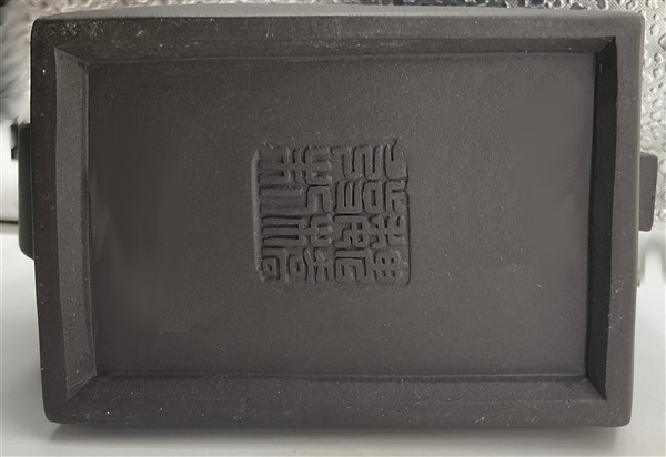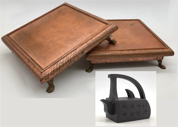 Lotto composto da due basi di forma quadrata rivestite in rame con piedi ferini (cm 25,5x25,5x6 cad.) e una piccola teiera orientale (h cm 9,5) (difetti)