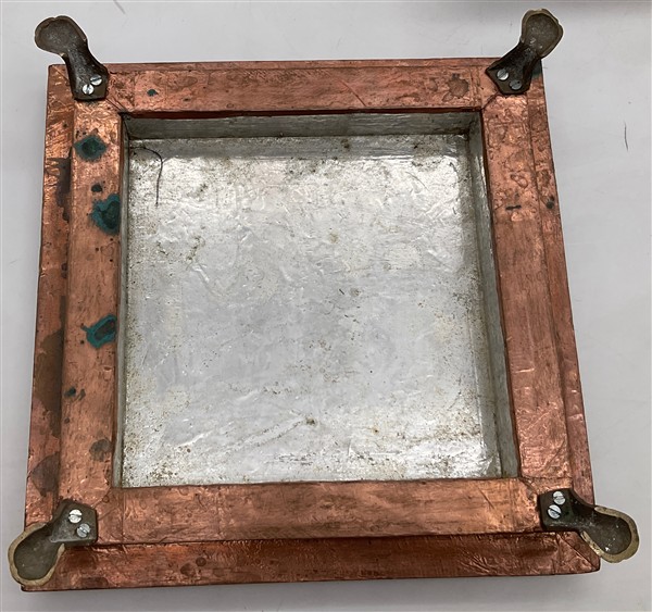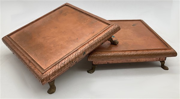 Lotto composto da due basi di forma quadrata rivestite in rame con piedi ferini