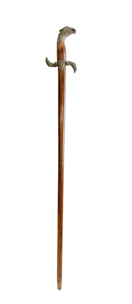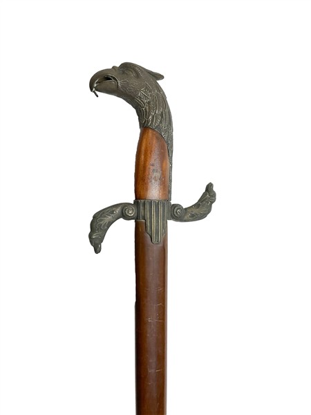 Bastone da passeggio con canna in mogano e presa simulante l'impugnatura di uno spadino con testa di grifone (h cm 91) (difetti e mancanze)