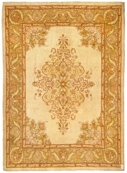 Tappeto Amritzar, India, fine secolo XIX. Decoro con leggero medaglione lanceolato nei toni del beige, rubino e verde oliva chiaro su campo bianco, ornato da quattro angolari nelle medesime tinte. Bordura Herati su fondo verde oliva chiaro (cm 353x280) (difetti)