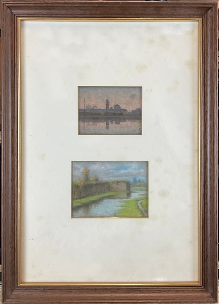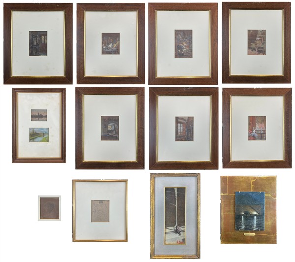 Lotto composto da dieci dipinti di diversi soggetti, autori, tecniche e misure (cm max 24x34). in cornici (difetti)