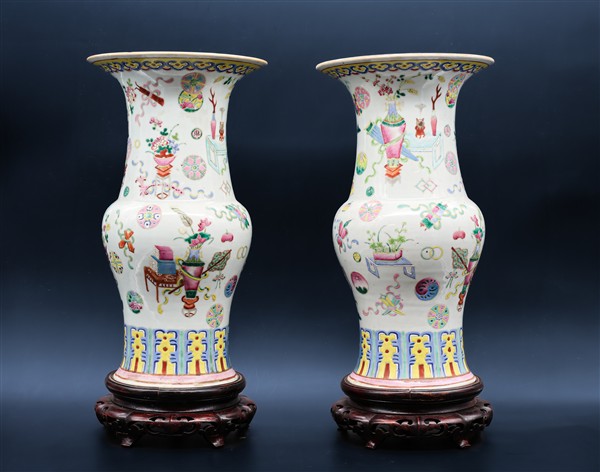 Coppia di vasi in porcellana policroma decorati con oggetti preziosi Cina, dina
