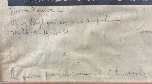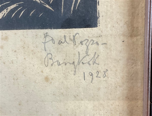 "La guerra fra i Birmani e i Siamesi", Bangkok, 1928, xilografia prova d'artista, firmata, locata e datata in basso a destra, firmata e dedicata. In cornice (foglio cm 65x48) (difetti)