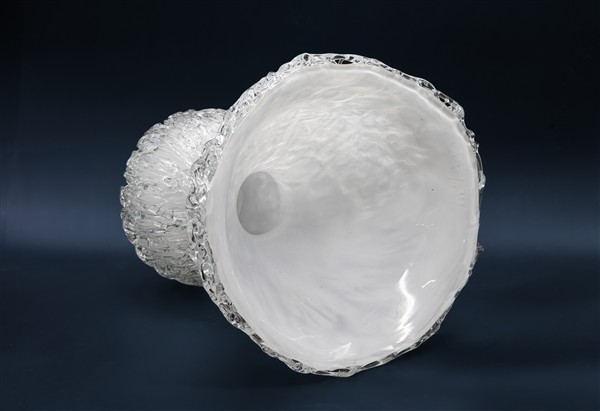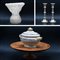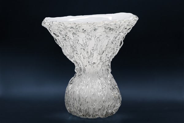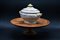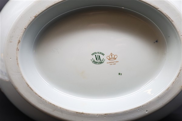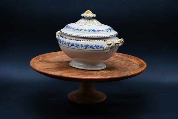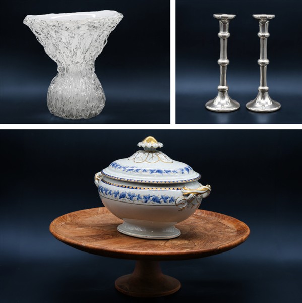 Lotto composto da coppia di candelieri in peltro argentato (h cm 42), una zuppiera in porcellana con coperchio, un'alzata circolare in legno (d cm 50) e un vaso in vetro (h cm 37) (difetti)