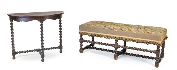Lotto composto da una panchetta in rovere con gambe e traverse di raccordo a torciglione (l cm 116) e una piccola console a mezzaluna di simile decoro (cm 77x64x34) (difetti)