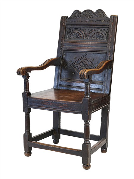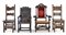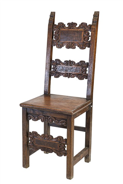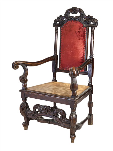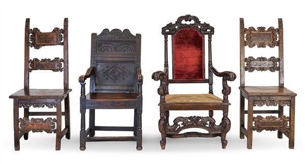 Lotto composto da due antiche poltrone e una coppia di sedie in legno intagliato di diversa epoca (h max cm 125) (difetti)