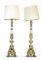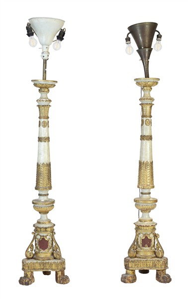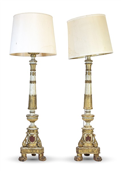 Coppia di grandi portaceri tripodi in legno intagliato, laccato e dorato con decori a foglie lanceolate e baccellature, piedi ferini. Inizio secolo XIX (h cm 143), adattati a luce elettrica con paralume (difetti e piccole mancanze)