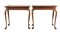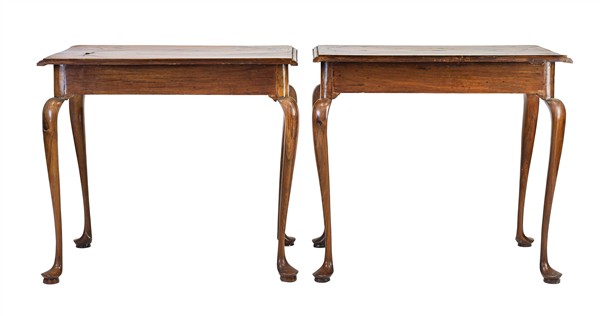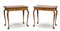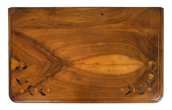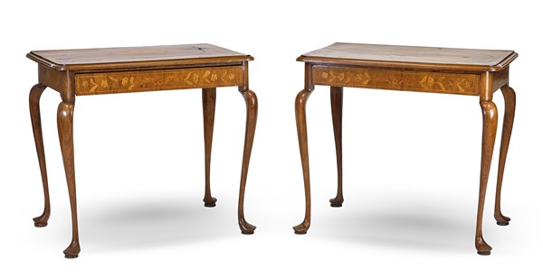 Coppia di tavoli da parete in legni di varie essenze con piano intarsiato e filettato a fiori e foglie stilizzati, un cassetto sottopiano, gambe mosse. Olanda, secolo XIX (cm 84x74x52) (difetti e restauri)