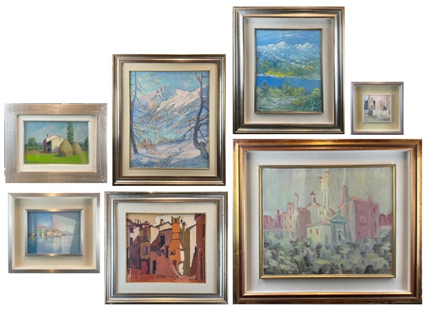 Lotto composto da sette dipinti ad olio su diversi supporti, di diversi soggetti, autori e misure (cm max 50x60)