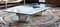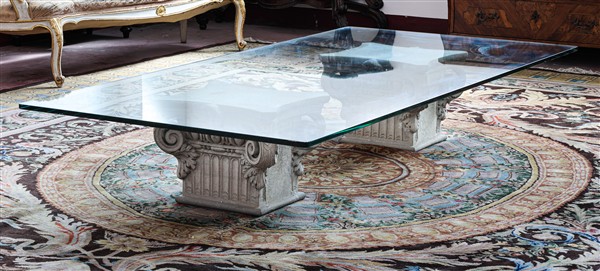 Tavolo da salotto con piano rettangolare in vetro e doppio sostegno a capitello in pietra scolpita a volute e in parte scanalata (cm 240x40x119) (difetti e sbeccature)
