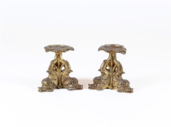 Coppia di candelieri in bronzo dorato in con sostegno tripode a forma di delfini (h cm 8) (difetti)