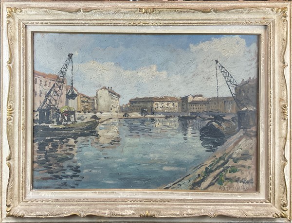 Giovanni Colombo da Busnago "Darsena, Milano" olio su masonite (cm 50x70) firma