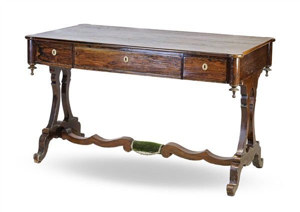 Scrivania da centro impiallacciata in palissandro con tre cassetti nella fascia, gambe sagomate raccordate da traversa (cm 136x80x71) (difetti e piccole mancanze)