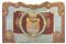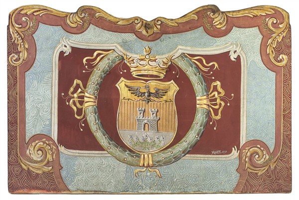 Pannello copricamino dipinto a tempera su tela con volute e centrato da stemma