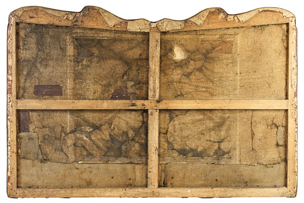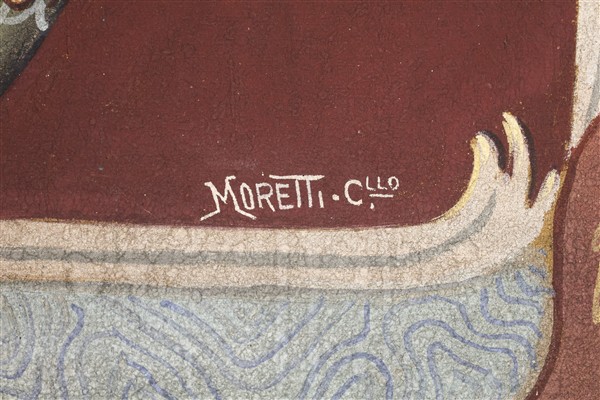 Pannello copricamino dipinto a tempera su tela con volute e centrato da stemma gentilizio della famiglia Robolini di Pavia, telaio sagomato. Firmato in basso a destra "Moretti C.llo". Inizio secolo XX (cm 169x112) (difetti)