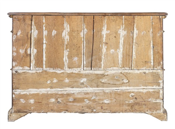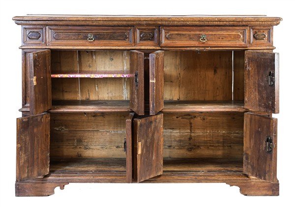 Credenza in noce e legni vari a otto sportelli e due cassetti sottopiano con pannellature e rilievi mistilinei. Secolo XVIII (cm 158x106x44) (difetti e restauri)