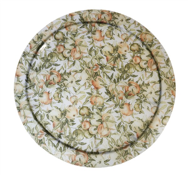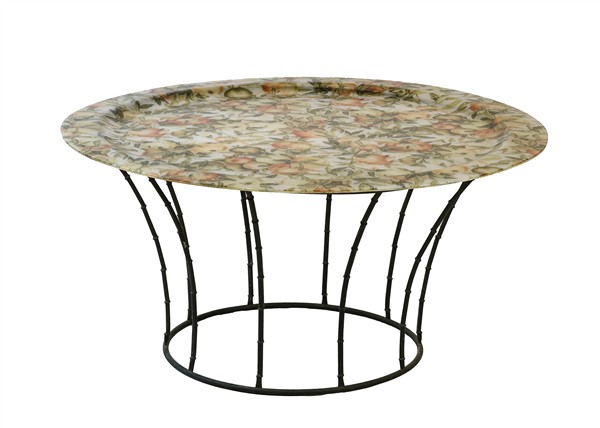 Tavolino basso da esterno con sostegno in metallo a finto bambù e piano circolare in resina decorata a frutti policromi (d cm 95, h cm 47) (difetti)