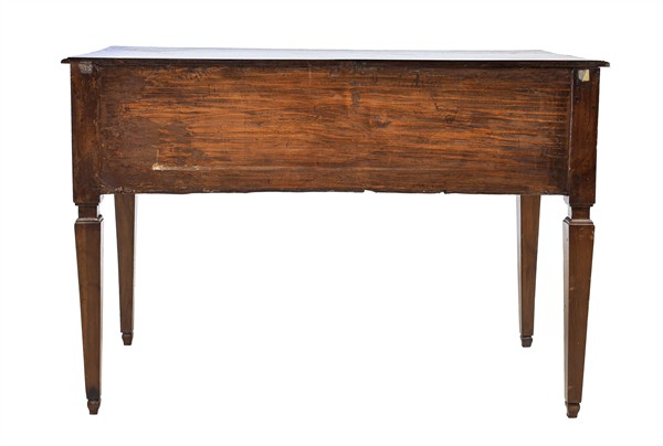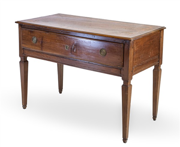 Tavolo da parete in noce con un cassetto nella fascia, piano con profilo intarsiato, gambe a obelisco rovesciato. Fine secolo XVIII (cm 116x80x56) (difetti)