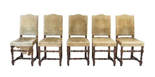 Gruppo di dieci antiche sedie in noce con gambe e traverse tornite a rocchetto (difetti)