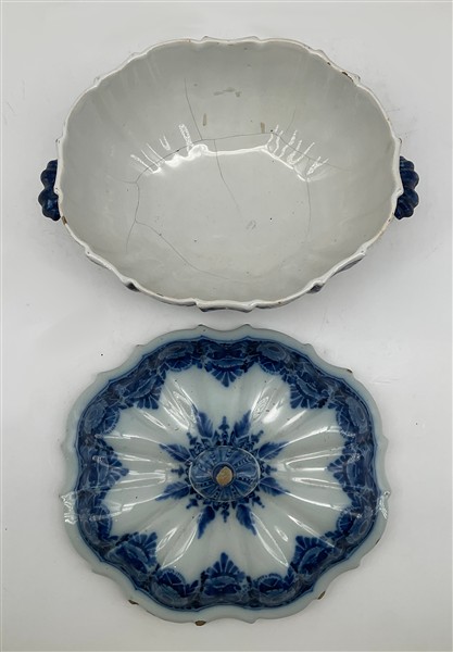 Manifattura di Nove, Bassano, secolo XVIII. Piccola zuppiera biansata e costolata con coperchio in maiolica dipinta in monocromo blu a fiori detto "fiore olandese" (cm 28x19x21) (difetti e probabile coperchio adattato)