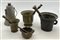 Lotto composto da quattro antichi mortai con pestelli in bronzo e altri metalli uniti ad una borraccia in peltro (h max cm 25) (difetti)