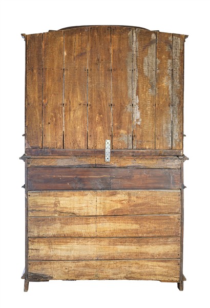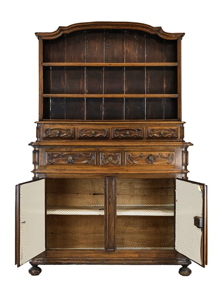 Credenza con piattaia in noce, parte inferiore a due sportelli pannellati e tre cassetti decorati da intagli a ragnatela, parte superiore a tre ripiani con quattro cassettini di stesso decoro, cimasa mistilinea e piedi a cipolla. Piemonte, secolo XVIII (cm 143x221x49) (difetti e restauri)