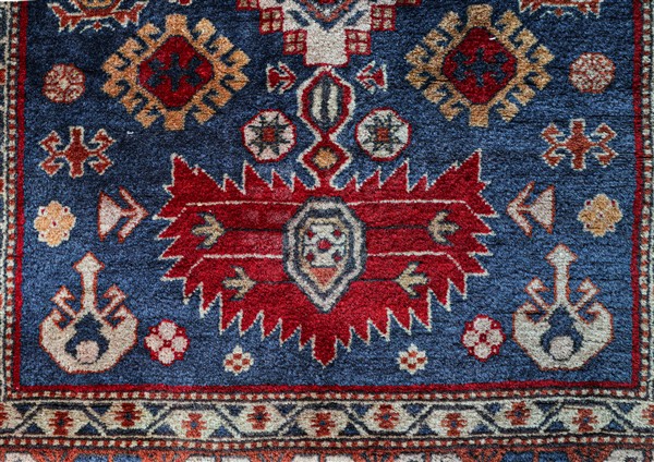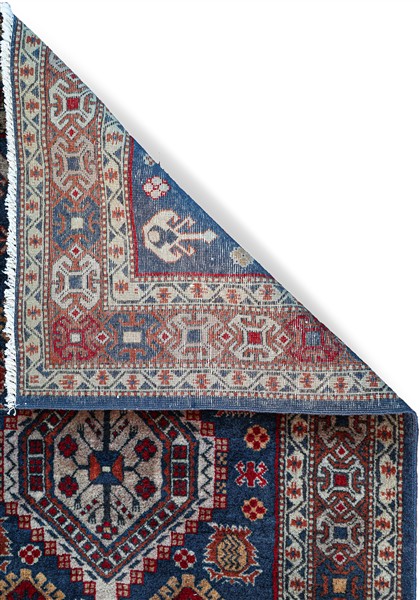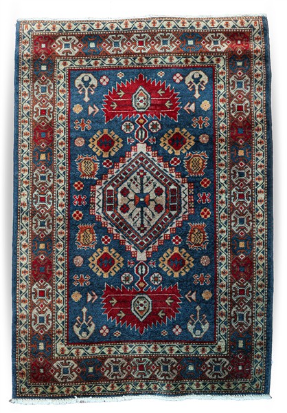 Tappeto Shirwan Kuba, Caucaso, secolo XX. Decoro con medagione esagonale con due puntali rossi su fondo blu cosparso di simboli floreali stilizzati (cm 114x80) (difetti)