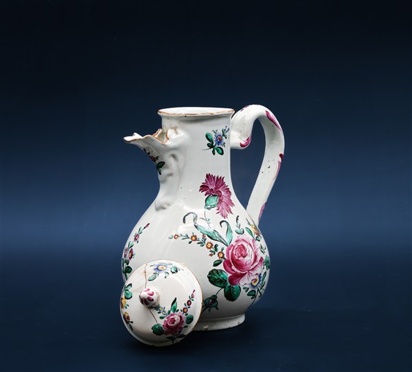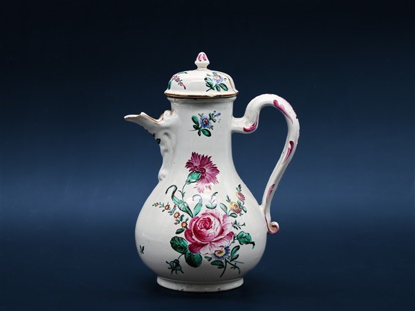 Manifattura Antonio Rolandi e Giuseppe Finck, Bologna, 1764-1789. Caffettiera con coperchio in maiolica dipinta in policromia a "mazzo di fiori fini" con rosa. (h cm 23) (difetti e restauro al coperchio)