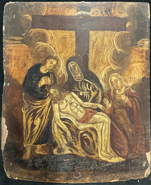 Scuola veneto-cretese del secolo XVIII "Deposizione" olio su tavola leggerment