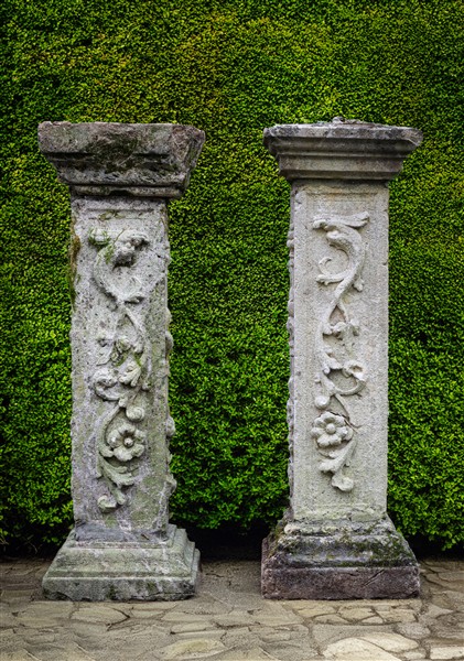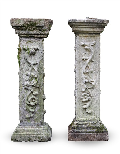 Lotto 815 | Lotto di due pilastrini decorati in rilievo con fiori e frutti, basi squadrate.