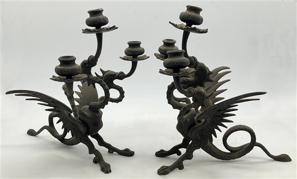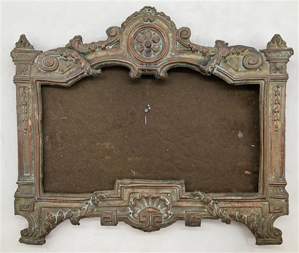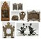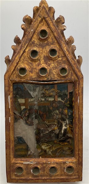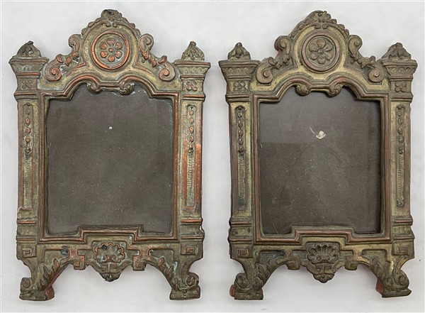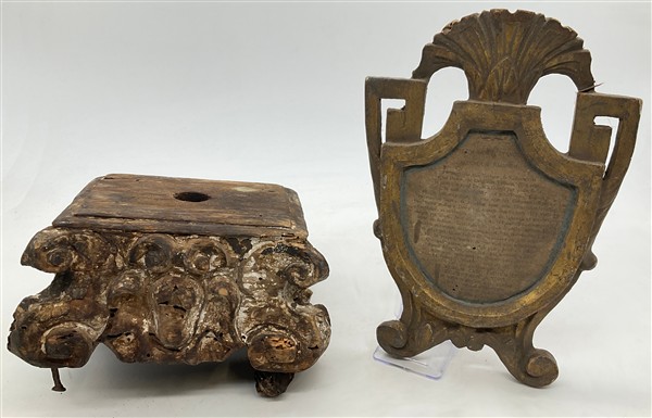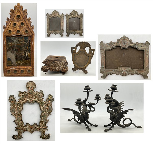 Due cartoni contenenti vari antichi oggetti tra cui fregi, un vetro eglomizzato frammentario, dei cartagloria e coppia di candelabri di epoche e misure diverse (difetti)