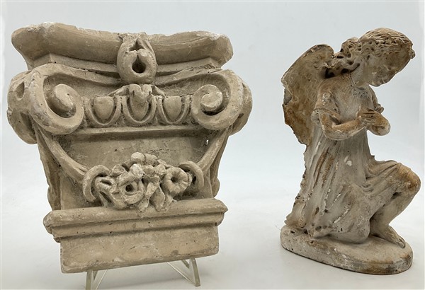 Lotto composto da una formella di Via Crucis in terracotta raffigurante la deposizione di Cristo (cm 39x28), un fregio a forma di semi capitello (h cm 24) ed una figura di angelo in preghiera in gesso (h cm 25) (difetti e rotture)