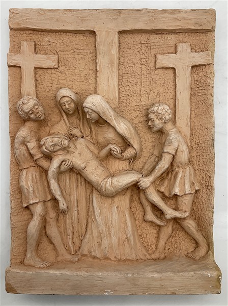 Lotto composto da una formella di Via Crucis in terracotta raffigurante la depo