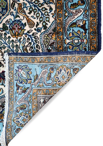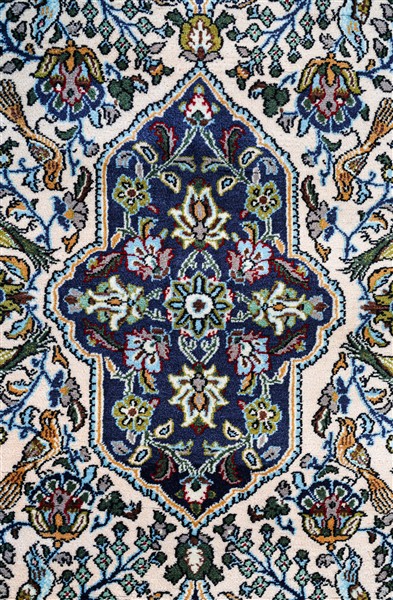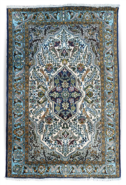 Tappeto Qum, Persia, prima metà secolo XX. Decoro con rami fioriti e volatili su campo beige con un medaglione romboidale a fondo blu notte al centro. Bordura Herati su fondo azzurro (cm 159x109) (lievi difetti)