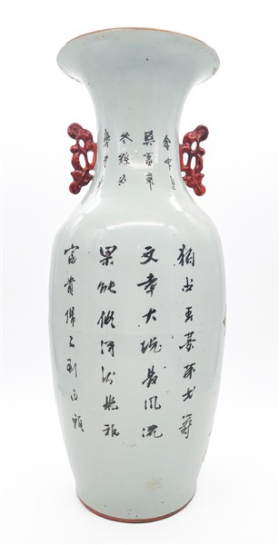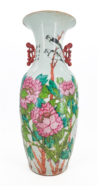Vaso in porcellana dipinta in policromia a motivi floreali e iscrizioni. Cina,