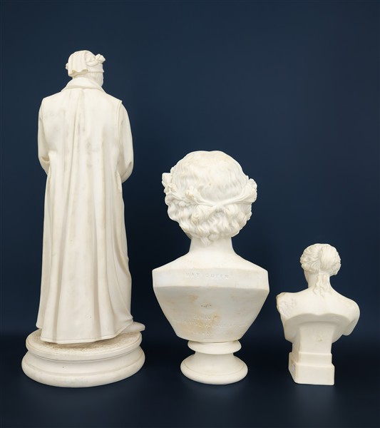 Lotto di tre sculture in biscuit raffiguranti Dante Alighieri (h cm 47), busto femminile dal classico (h cm 19) e una scultura inglese del secolo XIX raffigurante "May Queen", iscritta al verso (h cm 32) (lievi difetti)